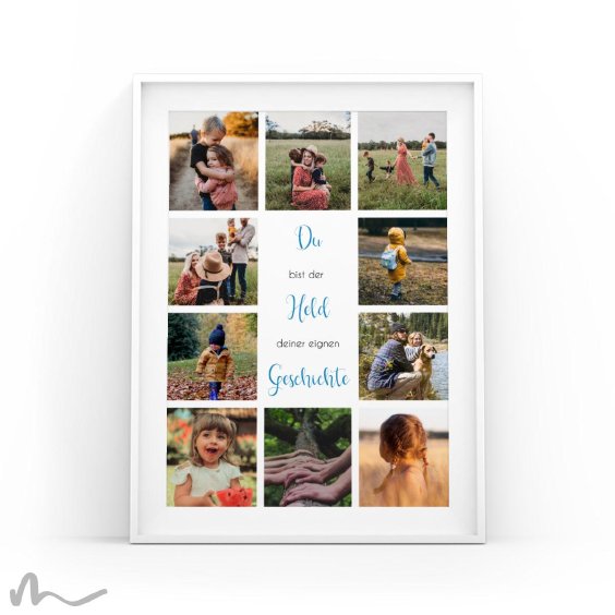 Poster im modernen Stil mit zehn Fotos und weißen Rahmen. Das Poster "Held" ist sehr bildlastig und bringt eure Fotos gut zur Geltung. Der Spruch "Du bist der Held deiner eigenen Geschichte" rundet das Design ab und kann selbstverständlich geändert oder entfernt werden. Perfekt für Familien- und Kinderfotos.